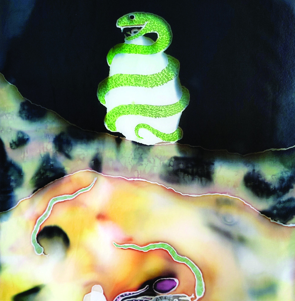 Detail from “Snakes and Eggs,” part of the the “Groundwork: Honoring the Aquifer” exhibit of silk paintings at the Meadows Center. Photo courtesy Texas State University.
