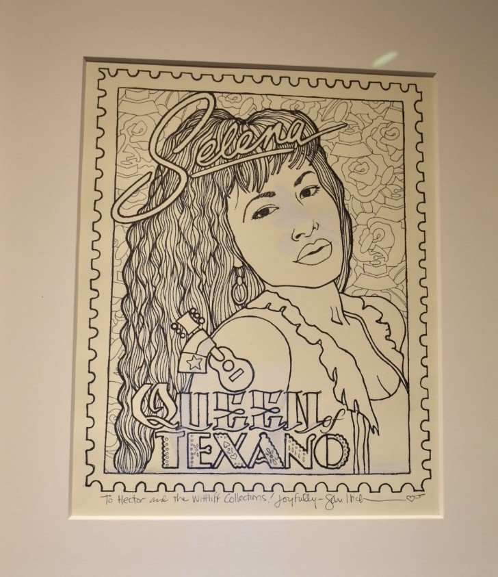 Sara Hickman, a renowned musician who also creates visual art, included a drawing of Selena in her “Texas Musicians Coloring Book,” an image now on display in the Wittliff gallery. Hickman said that Selena’s sincerity and genuine love for her fans inspired her to create a stamp for her coloring book.