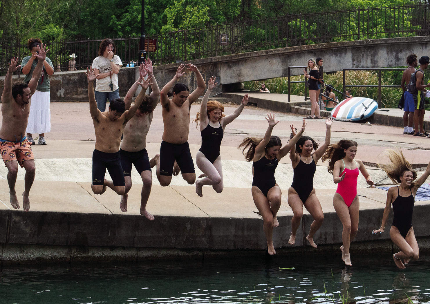 Even on weekdays in between classes, the ground fills up fast with people laying out or stopping by throughout the day. Music overlaps from every direction, and the steady current of the river, which stays a constant 72 degrees year-round, offers relief from the Texas heat.