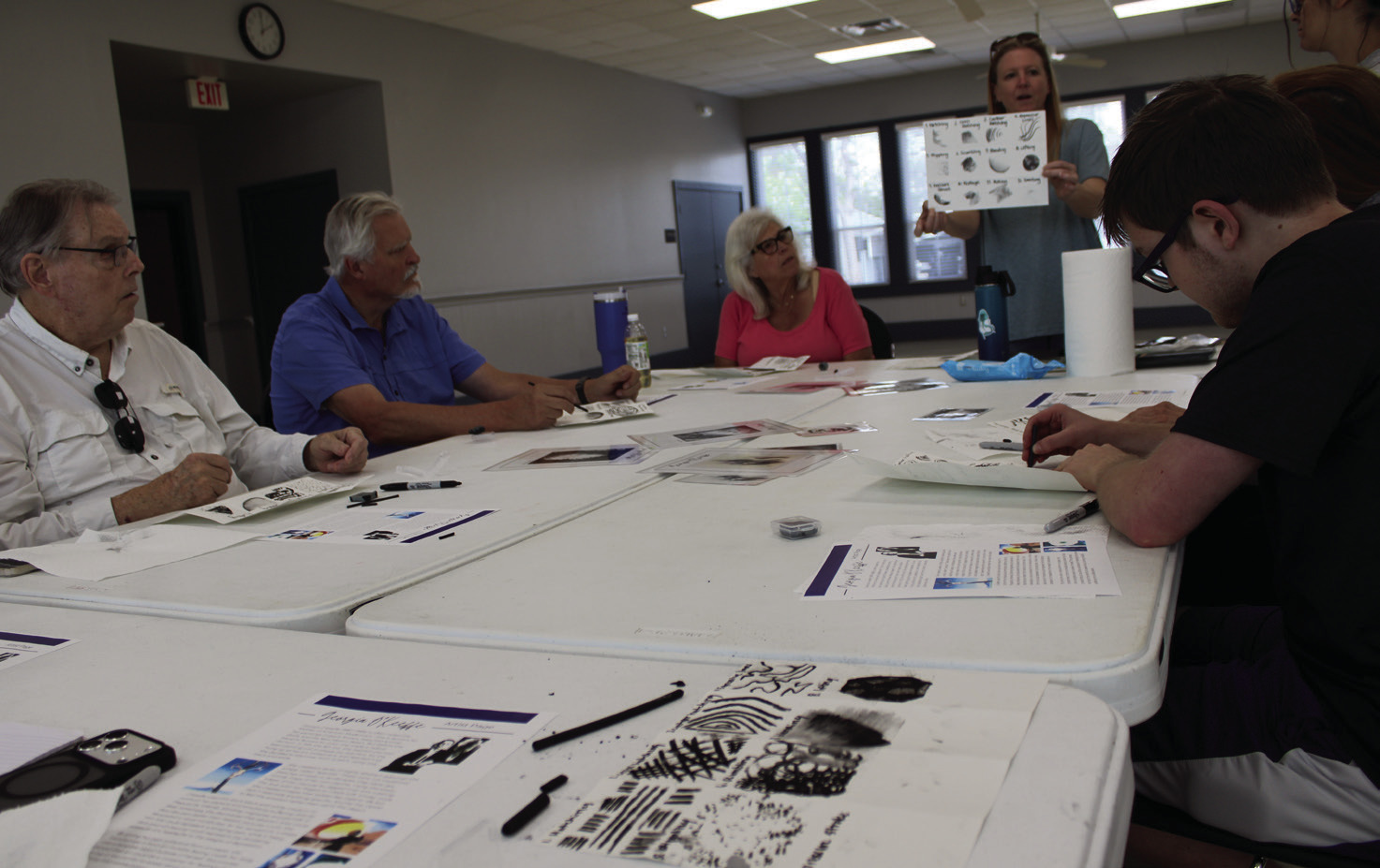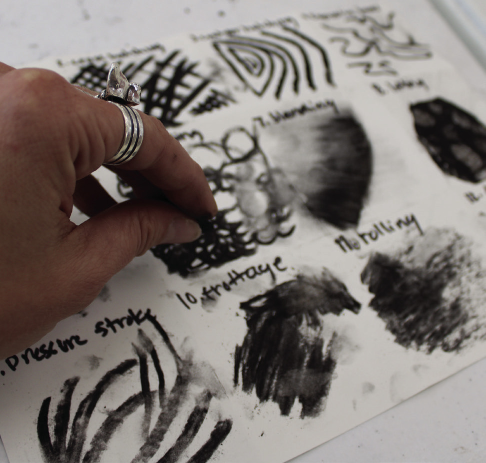 Instructor Brooke Pillifant, founder of the nonprofit Rough Draft, shows the class how to do a variety of charcoal techniques.