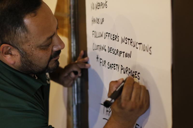 In the Hays County Sheriff’s Department’s negotiation room Deputy Danny Lombardo writes out the team’s surrender plan for the hostage taker.
