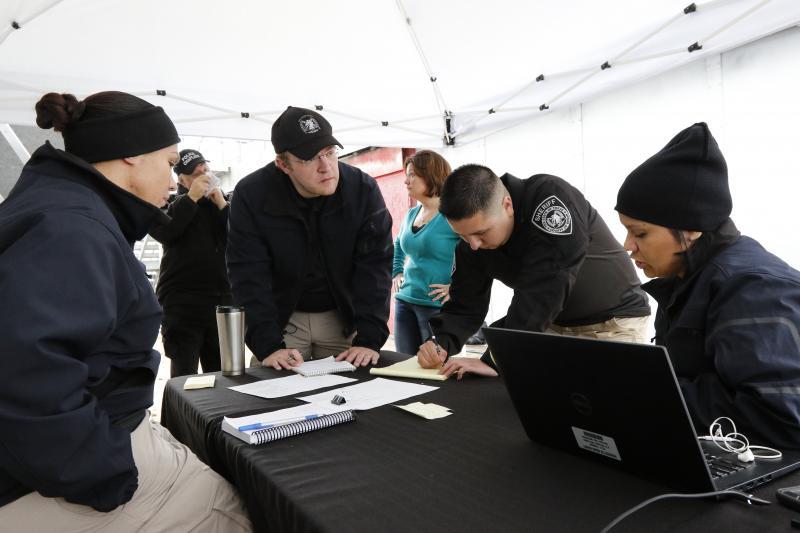 Outside the Bexar County Sheriff’s Department’s command vehicle Sgt. Alicia Lopez, Investigator Chris Andis and Deputy Jonathan Hernandez prepare for the next phone call.