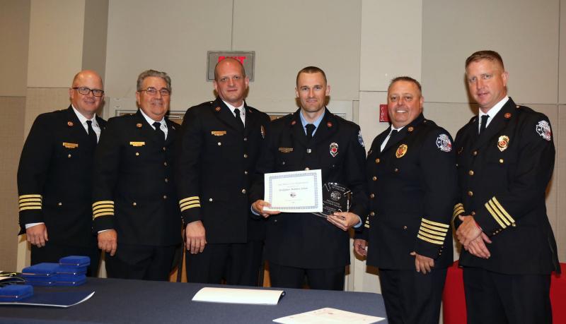 Firefighter Matthew Felton was awarded Firefighter of the Year. From left to right are Asst. Fire Chief Karl Kuhlman, Asst. Fire Chief Rick Rowell, Fire Marshal Kelly Kistner, Felton, Fire Chief Les Stephens, Battalion Chief John Koenig.