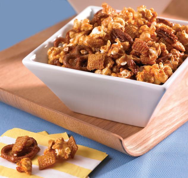 1. Heat oven to 300 F. In large bowl, combine popcorn, pretzels, pecans, peanuts and cereal squares; set aside.