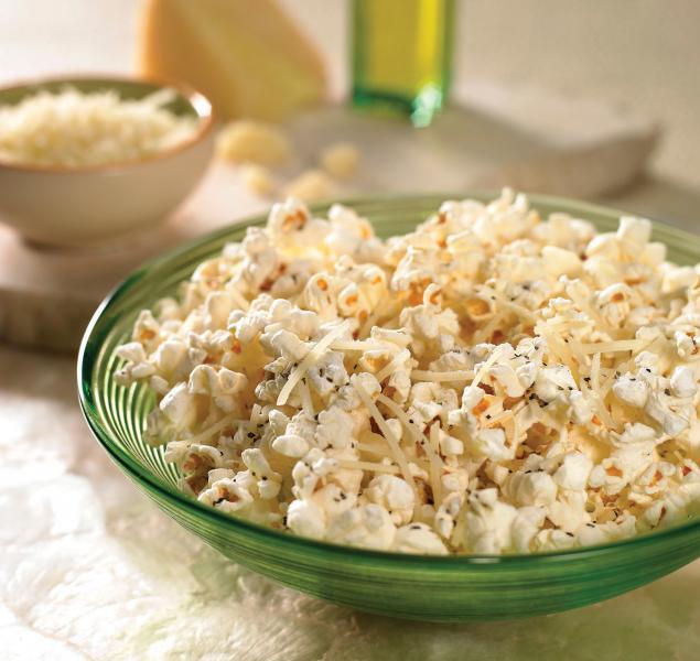 6. Sprinkle parmesan cheese, salt and pepper over popcorn; toss to distribute evenly.