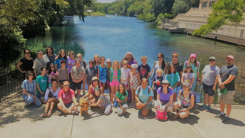 A proud group of SPLASH Patch recipients stands in front of Spring Lake, the headwaters of the San Marcos River.