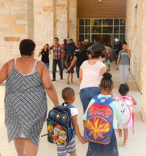 Parents walk their children to school at Bonham Pre-Kindergarten School on Monday.