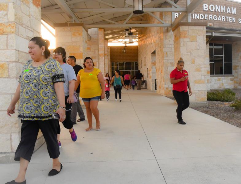 Parents walk out of Bonham Pre-Kindergarten School after dropping their children off at school before the first day of school.