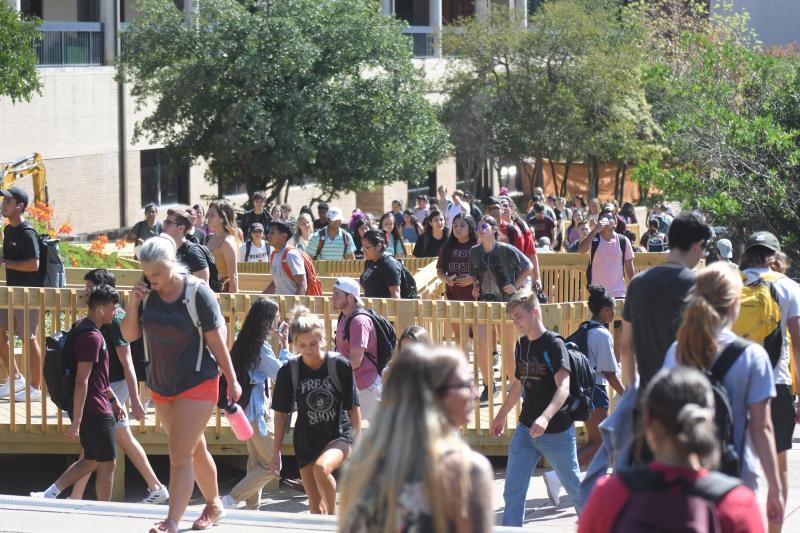 A winding walkway that leads to the front entrance of the LBJ student center is heavily used between classes.
