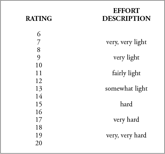 In some Physiology of Exercise text books another method of determining the level of a workout is used. It was developed by Gunnar Borg, a Swedish psychologist, and is called, “rating of perceived exercise” (RPE) scale. Rather than use the pulse rate the runner estimates the level of severity of his or her run on a scale between 6 and 20. It takes some time to determine what number on the scale a run will be. After a few runs it becomes easier and gives a more accurate estimate. The best part of the RPE scale is that it can be used by runners from beginner to elite and still be a good indication of the run. Using the scale numbers for ranking your effort, the runner will use 6 as being virtually no exertion at all, and 20 being the hardest effort possible. The table below is the Borg Scale of Rating of Perceived Exercise.