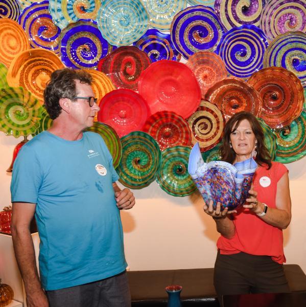 Tim de Jong and wife Vanessa Horodecky - de Jong, owners of Wimberley Glassworks, give away a work of art during the San Marcos business after hour.