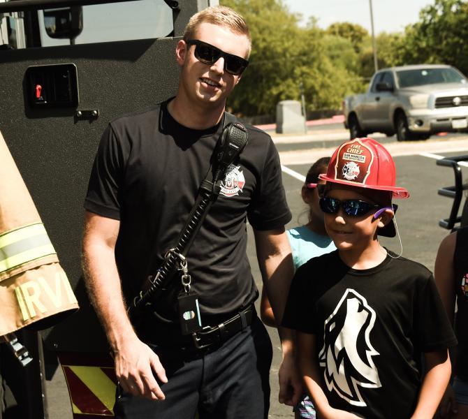 Austin Rich, 9, from New Braunfels, gets a fire helmet from firefighter Chad Irving.