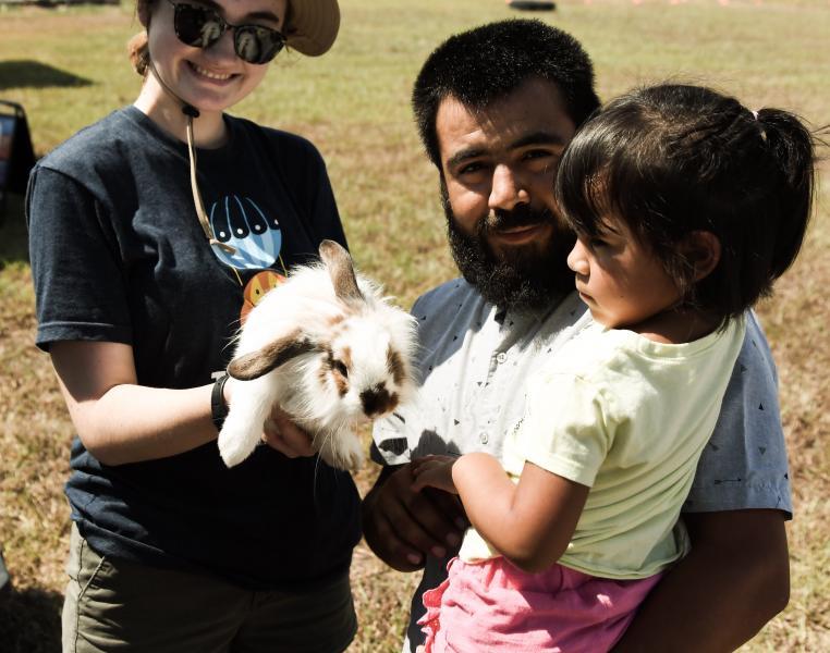 Stella Mendoza, 3, from San Marcos, is shy about petting the rabbit. Her dad Eloy tries to coax her.