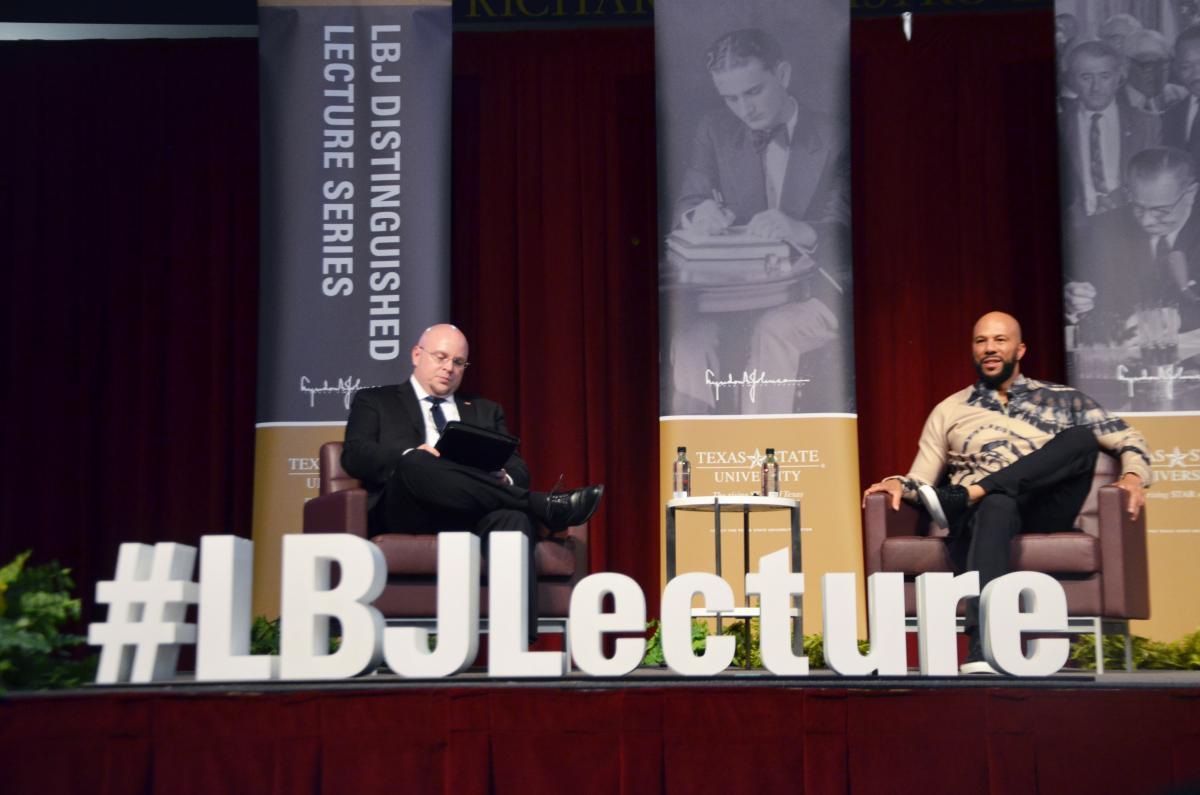 Texas State University Common Experience Director Twister Marquiss (left) and Common (right) hold a discussion during Wednesday's Lyndon Baines Johnson Distinguished Lecture Series inside Strahan Arena.