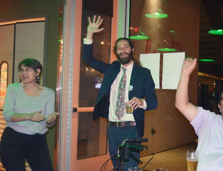 Maxfield Baker celebrates at a watch party Tuesday night at AquaBrew after earning a narrow victory for San Marcos City Council Place 1 over Mark Gleason. Daily Record photo by Jordan Burnham