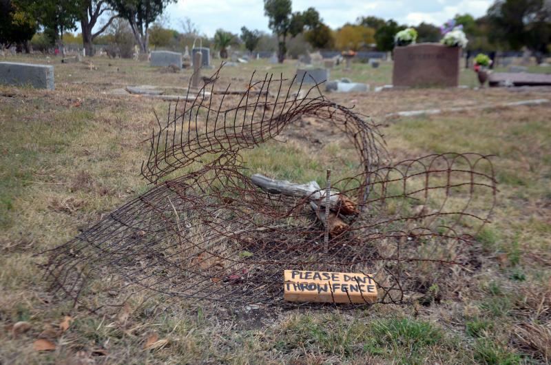 A sign with “Please don’t throw fence” sits near a damaged grave site.