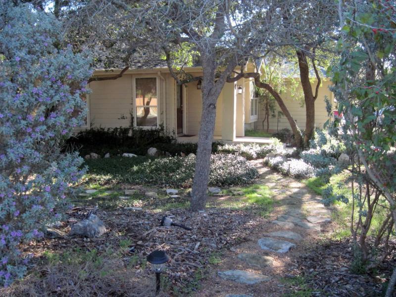 Replacing struggling turf grass under the trees with Asian jasmine has proved successful, but as with any landscape, evolution depends on the changing environment. Dick’s basic advice on gardening is simple: if you have money to spend on landscaping, spend 10 percent on plants, 10 percent on amendments, and 80 percent on good soil. Twelve years ago the McClintocks brought in soil from Gardenville to establish their plants in a healthy environment, and free mulch from the City of San Marcos is still added as needed. The McClintocks have laid several flagstone walkways, one leading from the side street to their front door, and they still have some building stones garnered from original neighborhood construction sites.