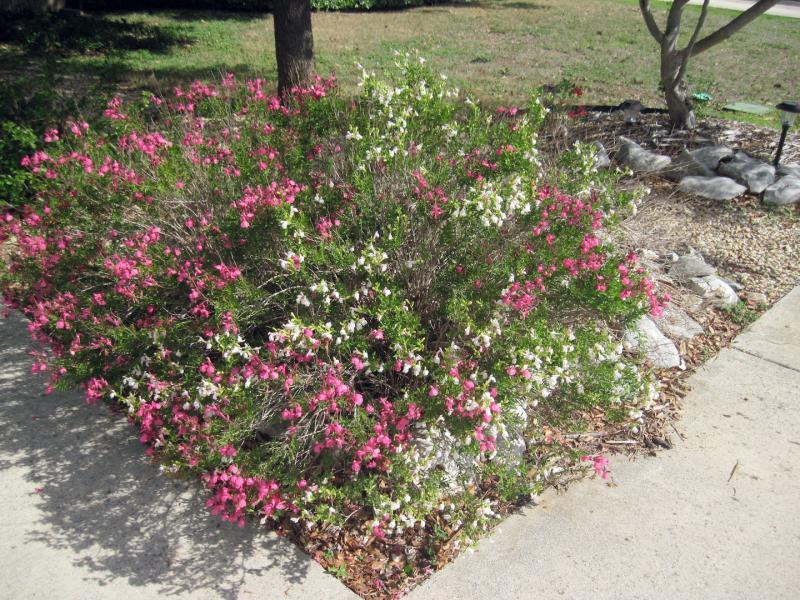 Although deep shade has discouraged grass in mid yard, baby bluebonnet plants are already popping up in sunny narrow areas beside the street. Margo says the blooms were almost overwhelming last year, but few homeowners would complain about two many bluebonnets. As for color in the yard, reliable sages are still blooming white and red on both sides of the driveway. Framing the rock walk from the side street to the entry are the purple blooms of a large Texas sage or cenizo and the red berries of a yaupon holly. A bed at the corner of the two streets includes a trailing lantana with lilac flowers, and a nearby oleander will offer pink blossoms in season. Finally, a lime green asparagus fern under the front window is thriving in partial shade.