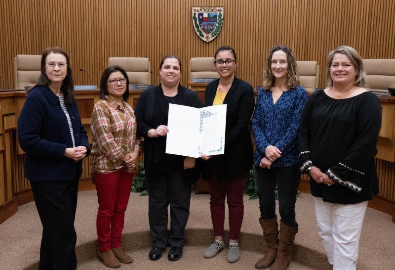 The City of San Marcos proclaimed Nov. 21 as San Marcos CISD Pep Day in recognition SMCISD PEP students past and present. Pictured above, Mayor Jane Hughson, Irene DeLeon, Tamara Tupper, Veronica Panduro, Ashley Barrett, Jennifer Vogel