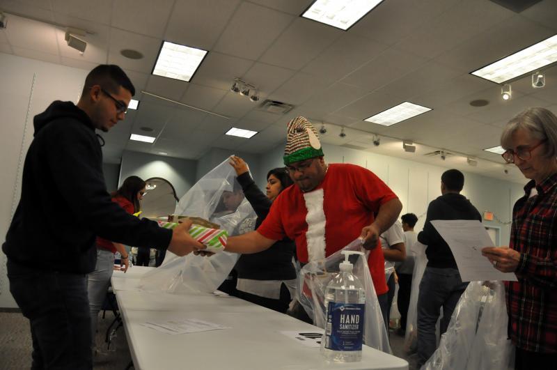 Juan Martinez (left) hands gifts to Blue Santa volunteer Juan Acosta(right). Approximately 100 people helped volunteer Tuesday to fill bags for 205 families in need.