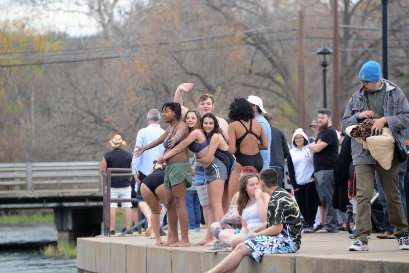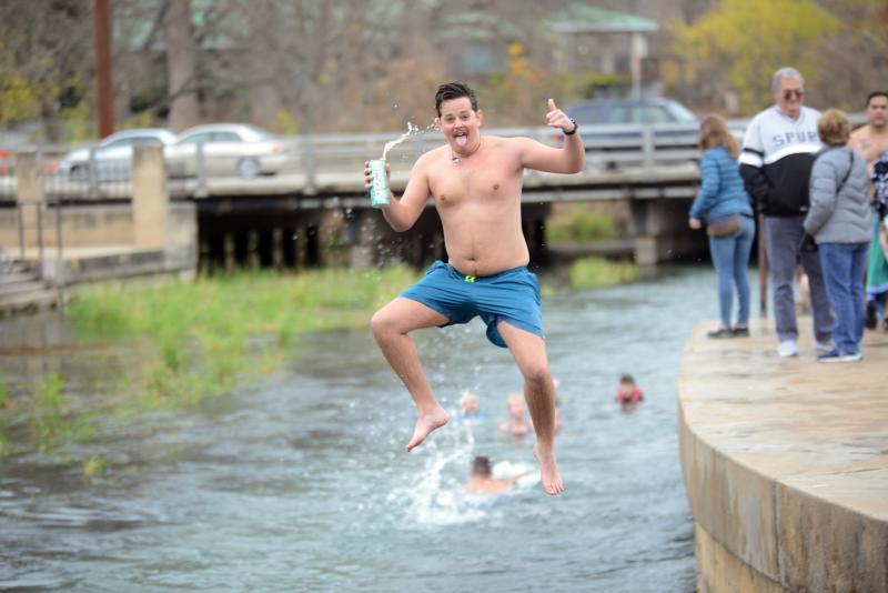 San Marcos began the new year with the annual Polar Bear Plunge into the 72 degree San Marcos River on Wednesday. San Marcos Swim team members, Ziatia Perkins (green shorts), Sophia Zavala (blue swimsuit), Nina Grandinetti (gray swimsuit) and Isabella Gilmore (in gray shorts) jump into the river. Daily Record photos by Gerald Castillo