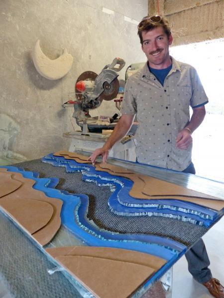 Priour layering the glass to be cut with the templates for Monument.
