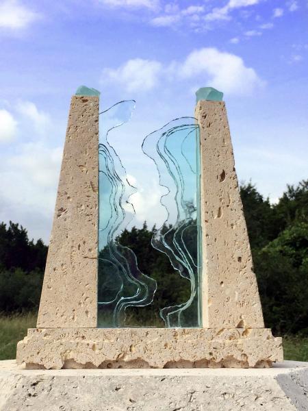 J.J. Priour became the community’s chosen artist to create the sculptured monument, which has been “on hold” since early 2016. His beautifully crafted model represents the Blanco River’s flow as sparkling aqua glass flanked on either side by a limestone bed. Raised like pillars, the carved limestone salutes the strength of the earth and the Wimberley community. The piece is finally in production.