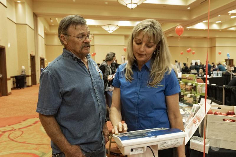 Weight loss coach Shaila Martin laughs helps Jay Horton understand his readout from the body composition analyzer scale at the San Marcos Family Medicine booth at the 2019 health fair.