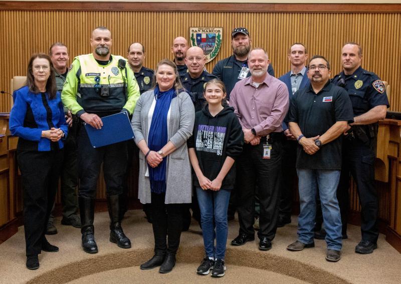 The city proclaimed Feb. 3, 2020 as Edward “Ed” Bradshaw Day. Bradshaw retired from the San Marcos Police Department after 22 years of service. Pictured, front row: Hughson, Ed Bradshaw, Veronica Bradshaw, Bob Klett, Victoria Bradshaw, Chase Stapp and Danny Arredondo. Back row, John Reeder, Brandon Winkenwerder, Rich Mizanin, Erin Clewell, Lee Leonard and Erik Spriegel.