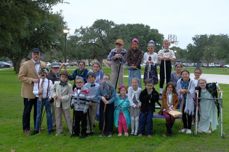 To commemorate the 100th day of school, students and teachers in the San Marcos Academy Lower School came dressed as 100-year-olds, wearing beards, bathrobes, bow ties, gray hair, and curlers and toting their miniature canes and walkers.