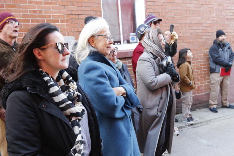 Bundled up against the cold, Janey Poole, Dianne Wassenich and Mayor Jane Hughson listen to the speeches in celebration of the work of local artist and muralist Rene Perez for the city’s Mural Arts Program.