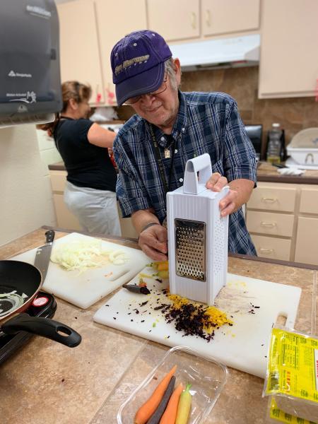 Roland grates carrots that went into vegan gyozas during a cooking class at Springtown Villa.