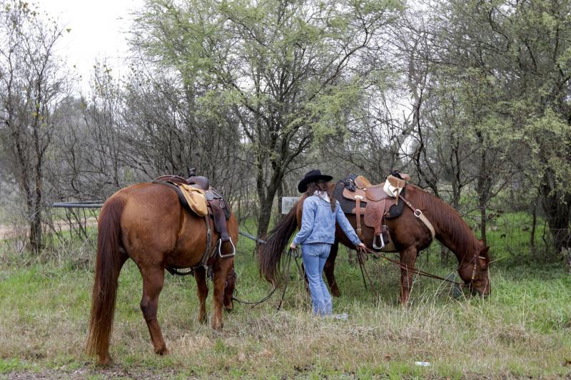 During the first break from riding after the group set off from Freeman Ranch Rachelle Keller holds the reins on horses Rex and Magnum as they graze on the grass.