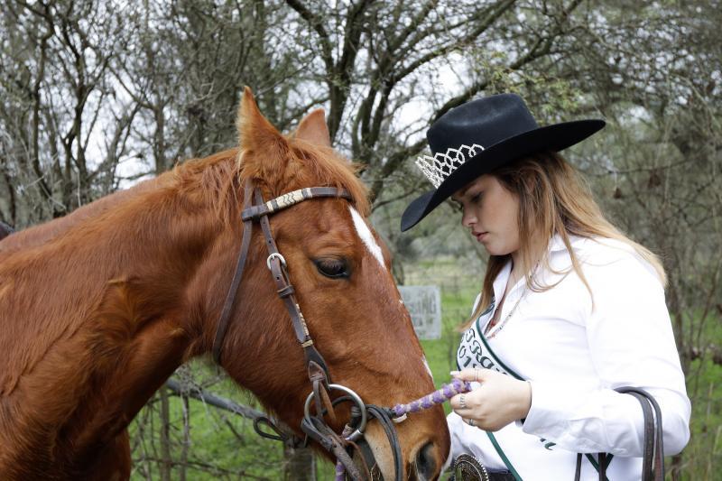 Queen Hannah Keller fixes the bit on her horse during a break from riding.