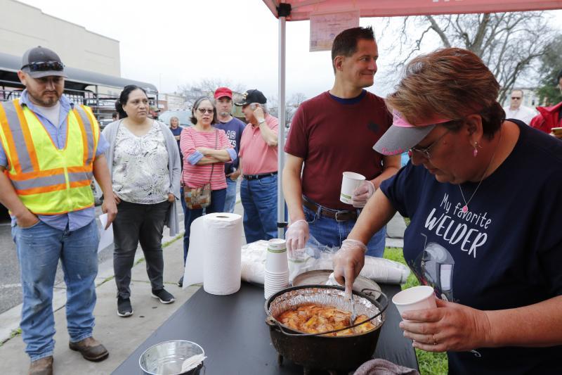 As the crowd waits for the appearance of the trail riders Janis Salmon dishes up cups of Main Street program’s famous Dutch oven peach cobbler.