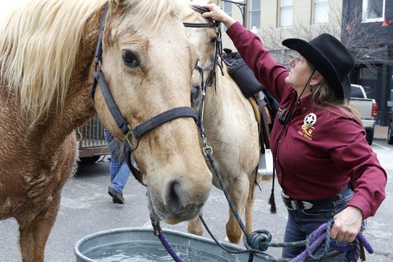 After more than an hour of riding, scout Chris Blackmor leads two horses to a water trough to rehydrate.