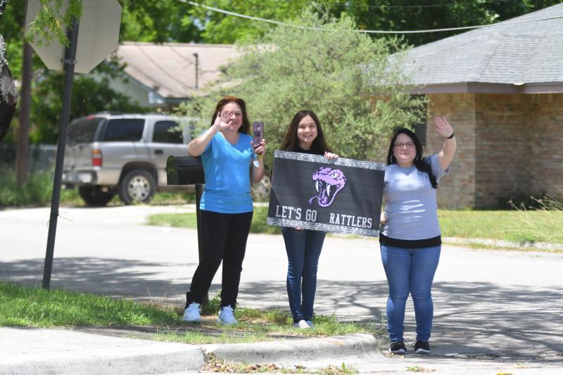 Goodnight Middle School teachers and staff visited their students Friday with a parade around their neighborhoods. The parade traveled through the following areas: Wallace Addition, Hills of Hays, River Hills, Mallard and Pintail loops, Redwood, Skyline Ridge, Rattler Road, Monterrey Oaks, 3rd Street, Paintbrush Street, Morningwood Drive and finished at Travis Elementary School. A school staff member holds up a sign saying, "We miss our OGMS scholars!" Daily Record photos by Gerald Castillo