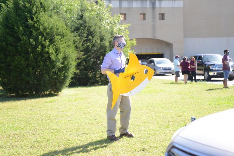 Director of the School of Family and Consumer Sciences at Texas State Dr. Andrew Behnk holds up a cardboard shark as students pass by.