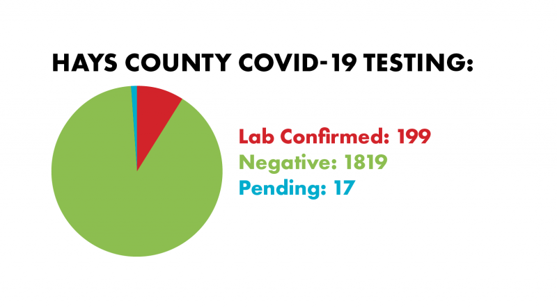 The Hays County Local Health Department has received 1,819 negative tests and has 17 pending tests. The county reported Wednesday that 122 county residents have recovered from the disease. There’s only been one COVID-19-related fatality in Hays County — a woman in her 80s who had been living in Buda with a relative.