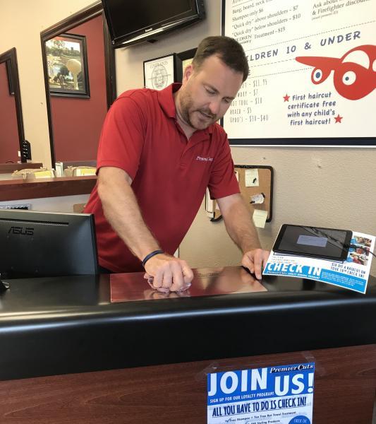Brian Olson, owner of Premier Cuts, cleans the front desk at his San Marcos location. Daily Record photo by Lance Winter