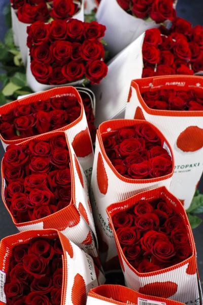 Bundles of red roses wait in a storage area at The Floral Studio for the more than 200 arrangements the store expects to make for the holiday.