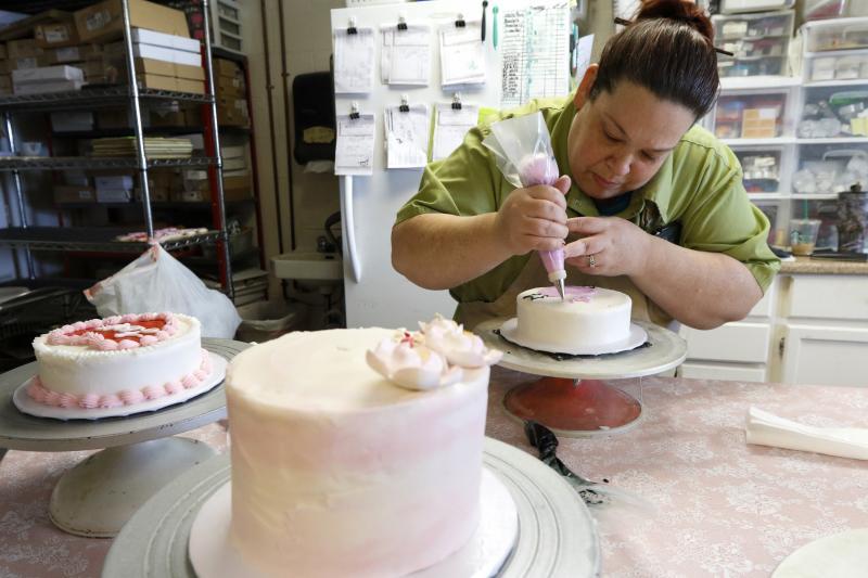 At Pennington’s Cakes, Lead Cake Decorator Sara Frias pipes purple buttercream icing in the shape of a heart and arrow on a chocolate cake for a customer’s Valentine’s Day order.