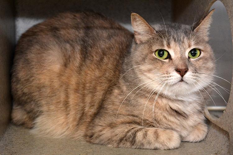 This bobtailed cat has such stunning green eyes! When 2-year-old Indigo came to our shelter, we thought she might be feral, but since November she has warmed right up and now allows us to give her love. Indigo has also tested positive for FIV.