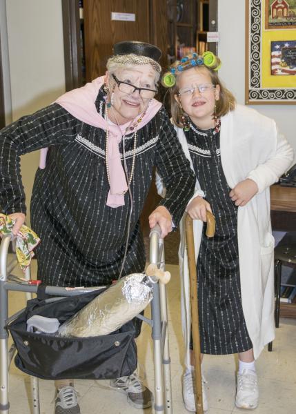 Connie Bagley and her granddaughter, Adeline Smith, dressed as 100-year-old twins for the San Marcos Academy celebration. Photo by Bear Bryant