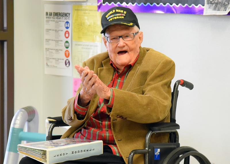 World War II veteran Leroy Moddrell, who turned 100 on Jan. 20, enjoys his visit to the SMA Lower School. Photo by Don Anders