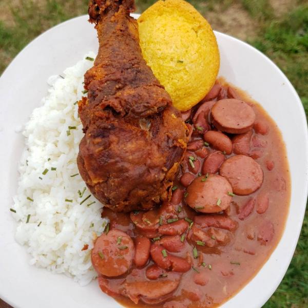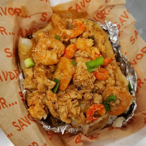 Above, HurryBack Catering's Cajun red beans and rice with andouille sausage (left), and a fried chicken swamp potato. Photos courtesy of HurryBack Catering