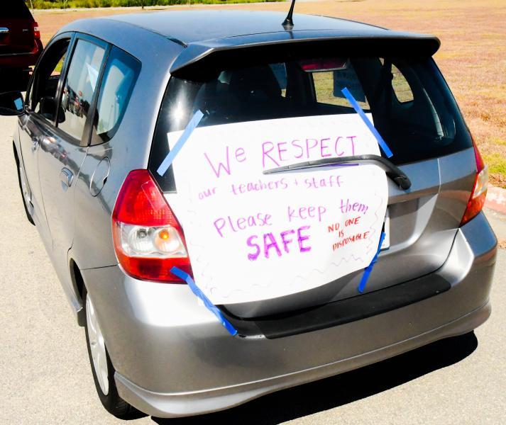 San Marcos community members and teachers led a caravan-style rally Friday to show support for teachers who are advocating the need to work from home as they are called back to campus for professional development on Aug. 17.