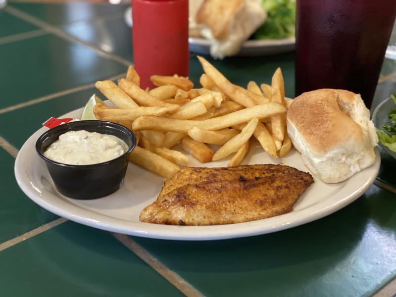 Grins Grilled Cajun Catfish served with French fries and a house salad with thousand island dressing (not pictured).
