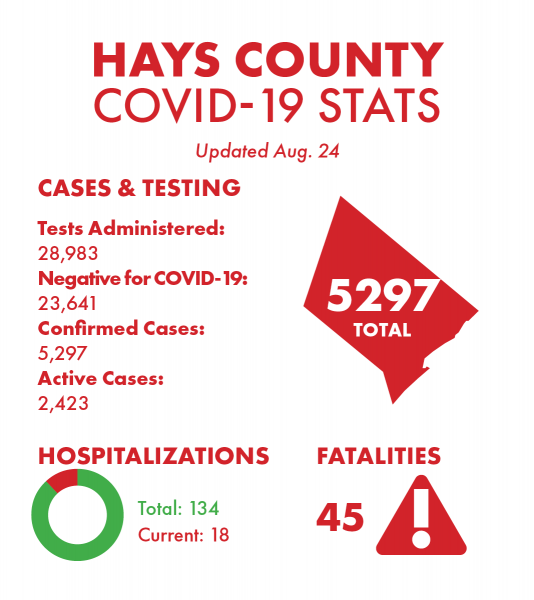 There are currently 2,423 active COVID-19 cases as of Monday — two fewer than Friday — and there have been 5,297 total cases since the first diagnosis of the virus in Hays County on March 14.