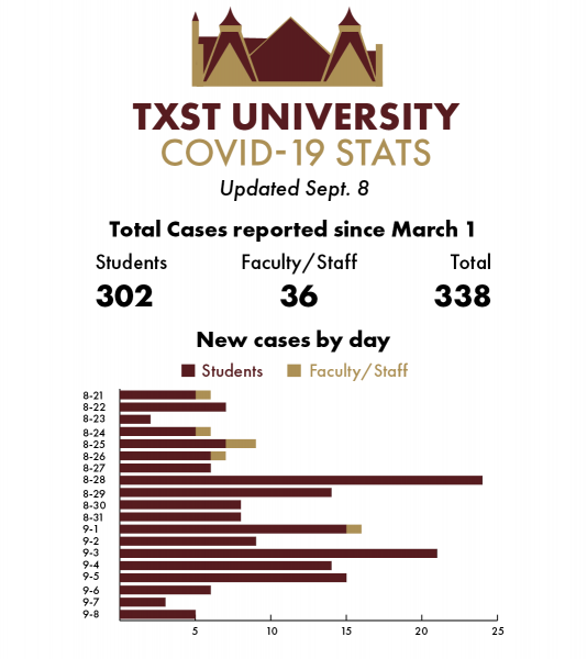 At Texas State University, an additional 14 cases have been reported as of press time Wednesday. Texas State has recorded 338 total coronavirus cases since March 1 — 302 among students and 36 among faculty and staff.
